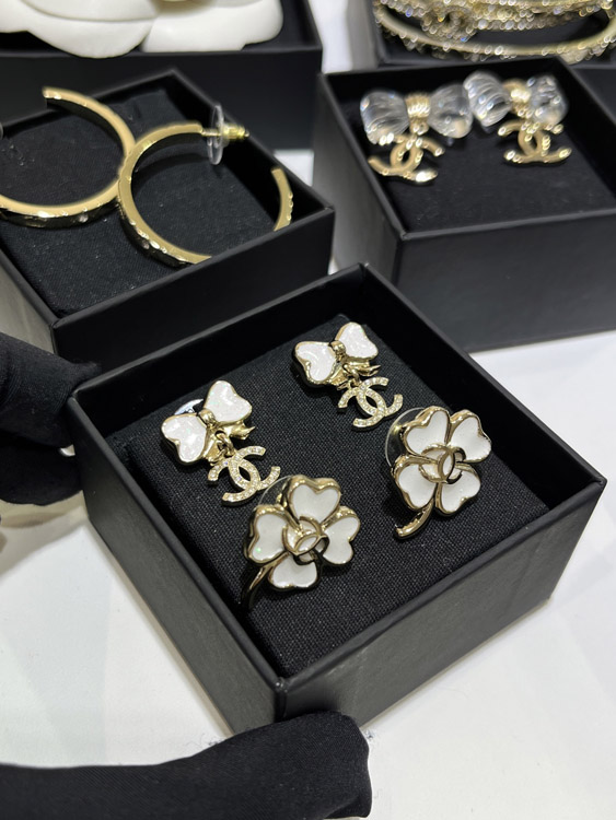 Chanel white glitter enamel bow gold full diamond double C earrings-3745